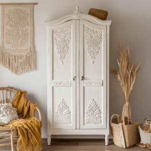 Hand carved white bar cabinet with leafy cut-out design, golden legs