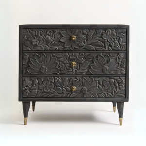 Handmade black bedside table with drawers in intricate white floral bone inlay design