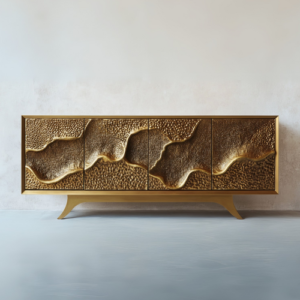 Handmade metallic black cabinet with radiant gold sunburst textured doors