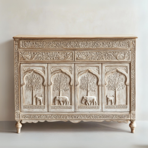 Hand carved rustic wooden cabinet with large hand-carved floral designs