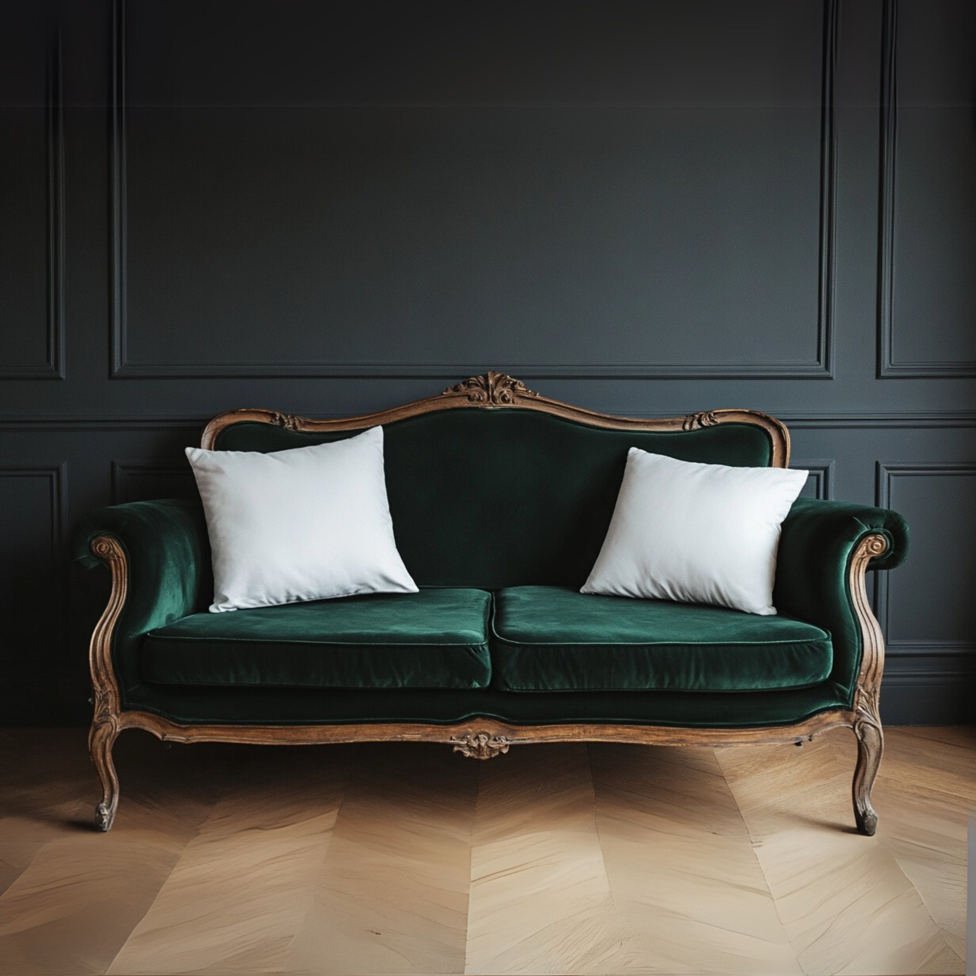Handmade vintage sofa with green velvet upholstery and carved wood frame