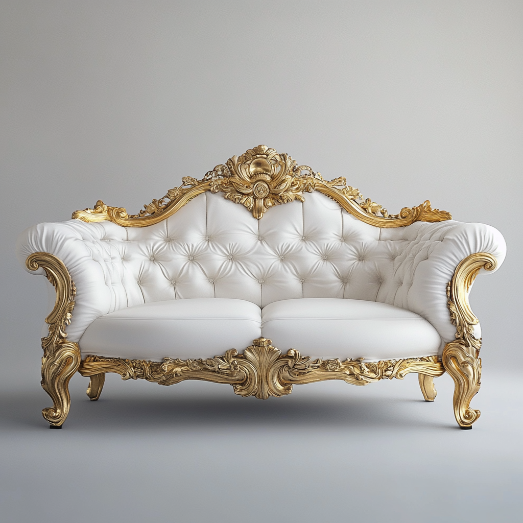 Handmade gold-trimmed tufted sofa with luxurious white upholstery