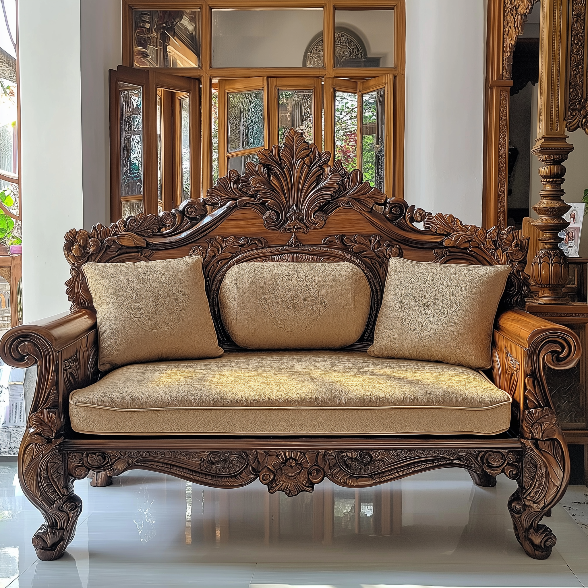 Handmade Intricately carved teakwood sofa with elegant beige embroidered cushions