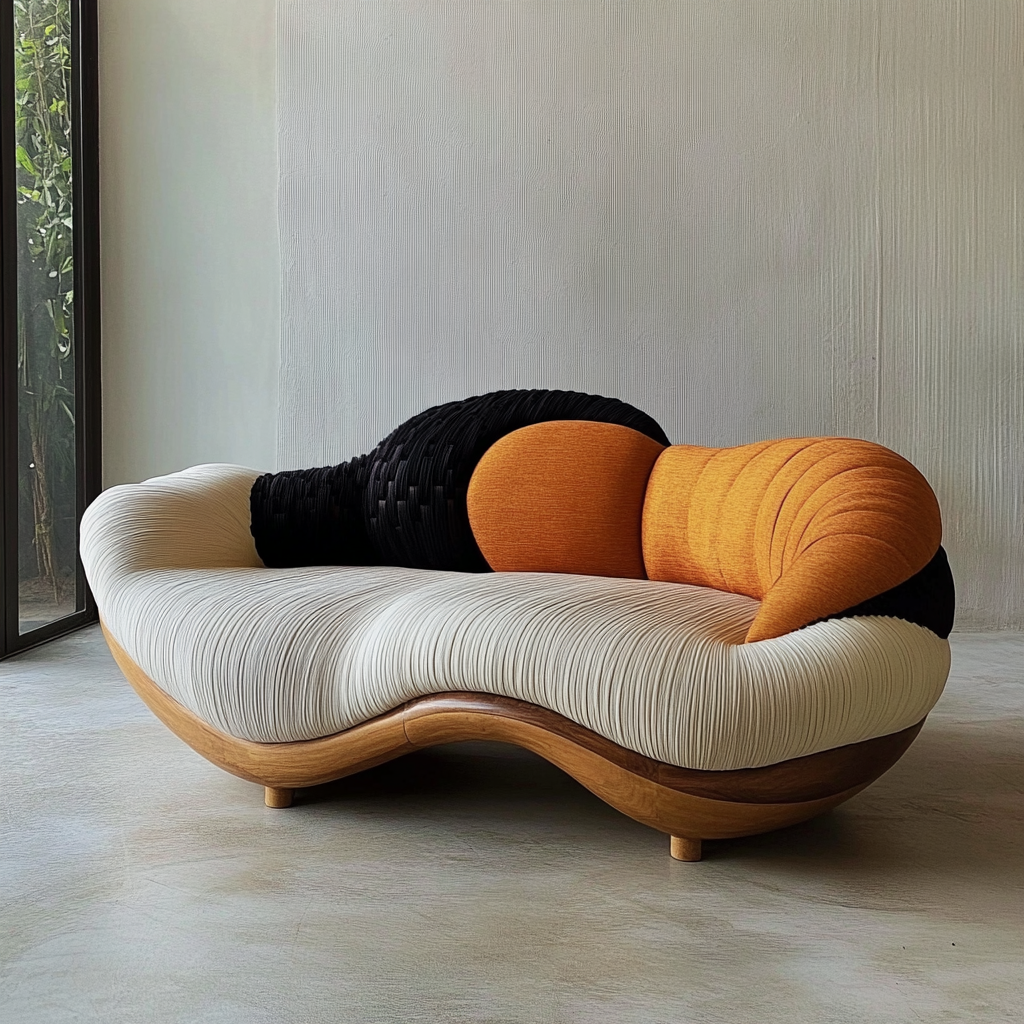 Handmade sofa sculpted in wood with vibrant modern upholstery